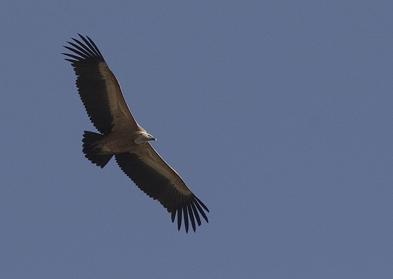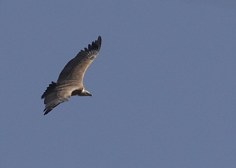 (4.) Juvenile Eurasian Griffon, the same bird as in the preceding photo. Note plain, rufous-tinged coverts. Eurasian Griffons do not show streaked upperwing coverts, like Himalayan Griffon in juvenile and subadult plumages (those of adult Himalayan are so pale that they do not necessarily appear streaked).