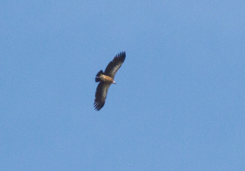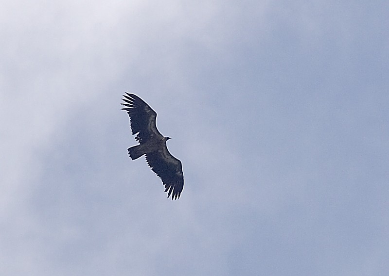 (4.) The most difficult photo in this set, partly because the bird was not seen very well in the field. Elangash, Altai Republic, Russia, 23 June 2010. The body seems to be somewhat rufous, and the wings are not very broad. However, the body seems to be large and thick and the head proportionately small, as in Himalayan Griffon. Also the pattern of the underwing coverts supports the identification as a subadult Himalayan Griffon: Eurasian Griffon may show this much whitish colour, but it occurs as a longitudal central bar with a separate patagial bar visible. Also, the black greater coverts of Eurasian Griffon should be visible in this photo. In the field, the bird appeared to be about the same size as the accompanying Cinereus Vulture (Aegypius monachus).