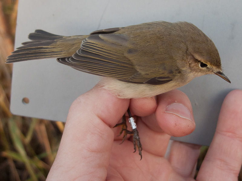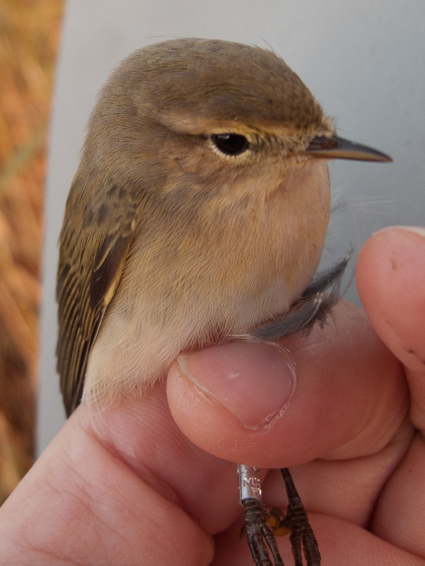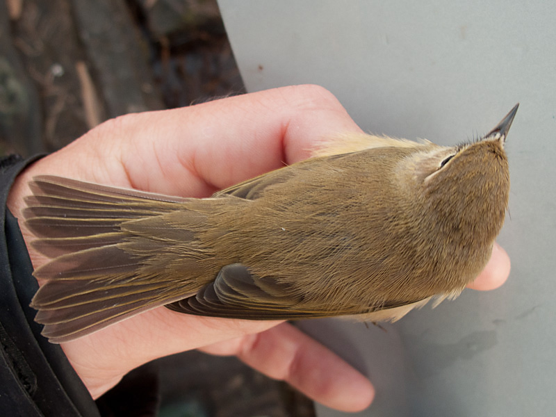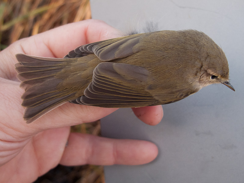 The bird below (38367U) was ringed on 17 September 2011. The wing was 61 mm and the wing-formula 6/0/0/0/2/5.5/7. These measurements and all other characters were very normal for Chiffchaffs in this area.