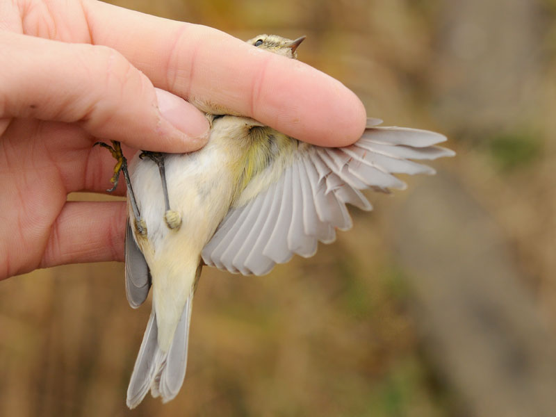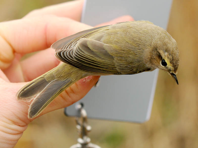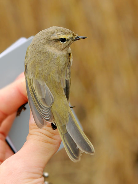 Notes from the ringer, Petteri Lehikoinen: the fore-part of the supercilium showed a warm tinge, but it was difficult to assess whether the colour was yellowish or warm buffish. The same colour was apparent also on the breast-sides, inner parts of the undertail-coverts and the feathers on the tibia. There was no deep buffish tinge as in the most typical tristis individuals. In addition, on the mantle, neck and cap there were some feathers with greenish tips. The upperparts were greyish-brown, and the scapulars and rump showed a green tinge. The ear-coverts were buff, as were the flanks and most of the undertail-coverts. The underwing-coverts were yellow (except the greater coverts), and especially the axillaries were brightly yellow. The bird was not heard calling.