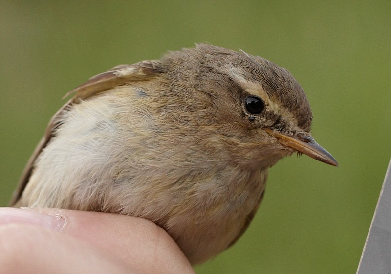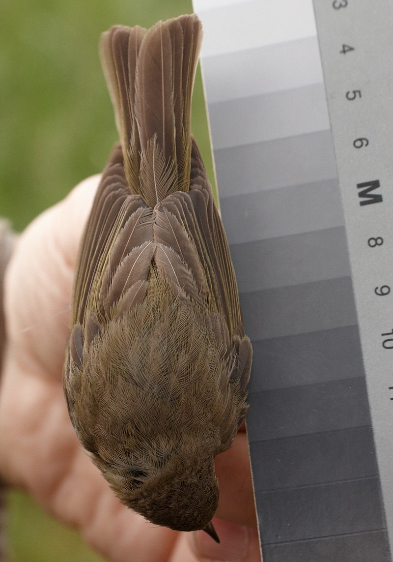 The following photos are of the male. The wing length was 65, wing formula 6,5/0/0/1/2/6/8 and bill 12,2. We think that the bird is a pure Common Chiffchaff, and there seems to be no hybrid traits. The wing length is typical for a common Chiffchaff male of subspecies abietinus.