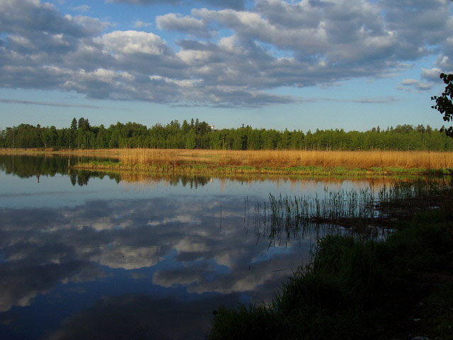 Lahden pohjoisrannalta kaakkoa kohden katsottaessa näkyy isompi ruovikko. Maisema on melkein kuin syvältä luonnon helmasta - mutta Turunväylä on kyllä lähellä ja sen jatkuva pauhu kuuluu (Kuvattu 1.6.2004)
