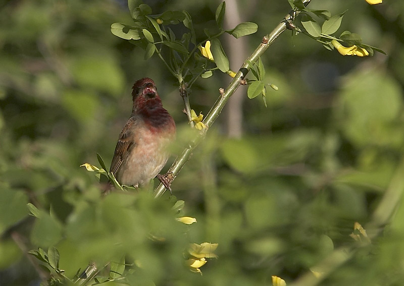 Punavarpunenkin on pensaikkoisten avomaiden tyyppilintuja ja yleinen Iso-Huopalahdella. Aikuinen koiras on värikäs näky . Laulu on kirkas vihellys. (Kuvattu 9.6.2005, äänitetty 9.6.2005).