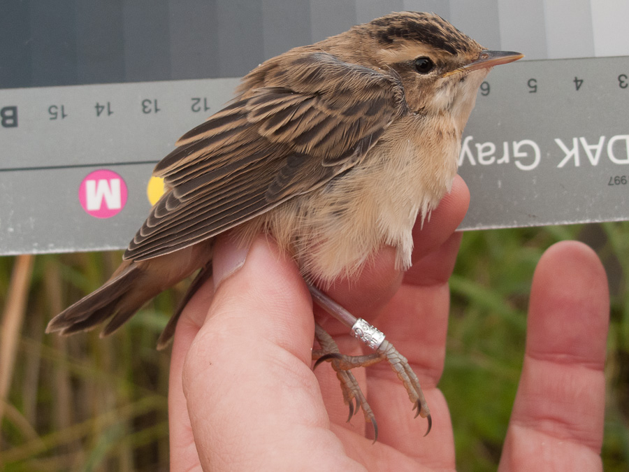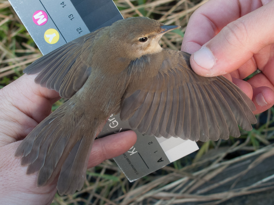 These young Blyth's Reed and Marsh Warblers were trapped at the same time, both from the sea side, so these birds were already mature enough to move to the reedbeds from their birth habitat in the bushes. The upperside colour of MW was yellowish buff, that of BRW with a colder olive tone - both very typical. The BRW shows distinct fault-bars - I do not remember seeing those in this species before. Probably cool rainy days in June caused problems for the parents to feed their young.