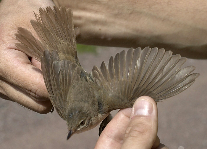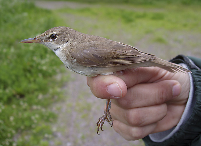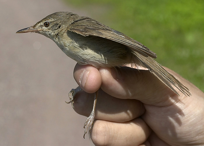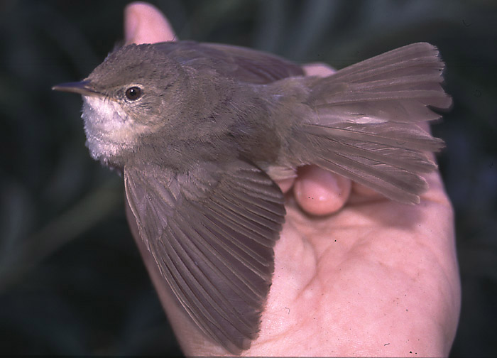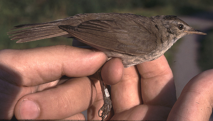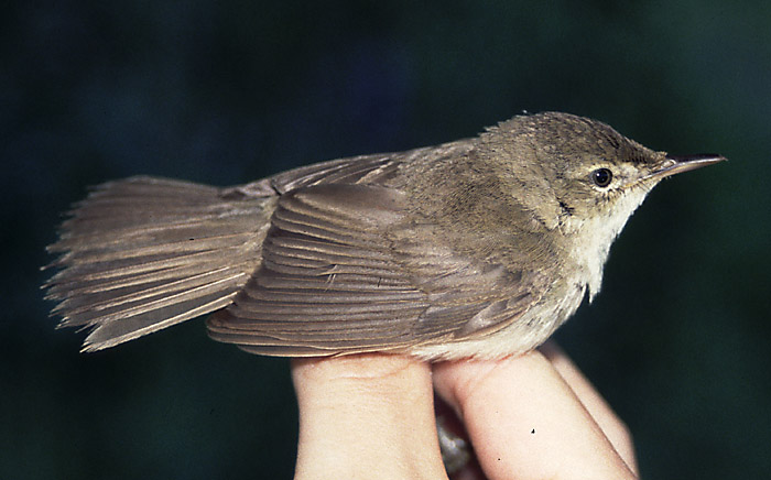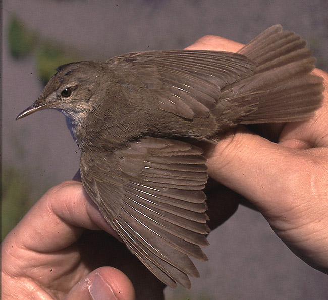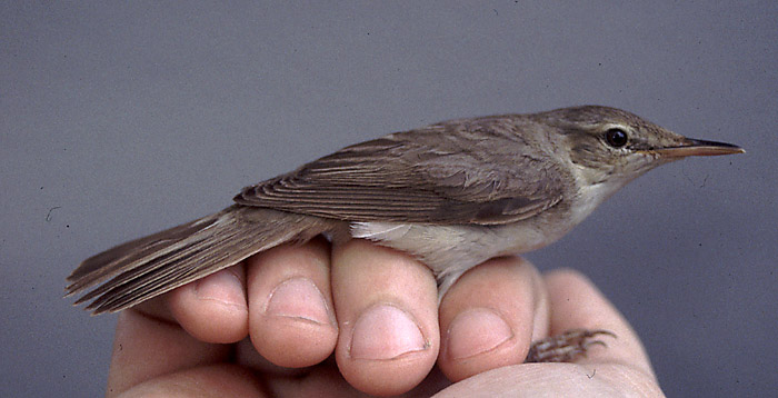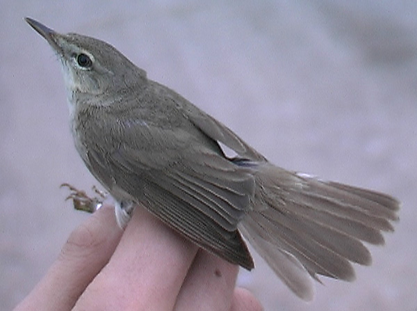 (1.) 24 July 1999 Joroinen, central Finland. Typical Blyth's Reed Warblers are quite worn and brownish grey when they arrive in Finland. Olive tones are restricted to rump (but many show a weak olive tone elsewhere on the upperparts).