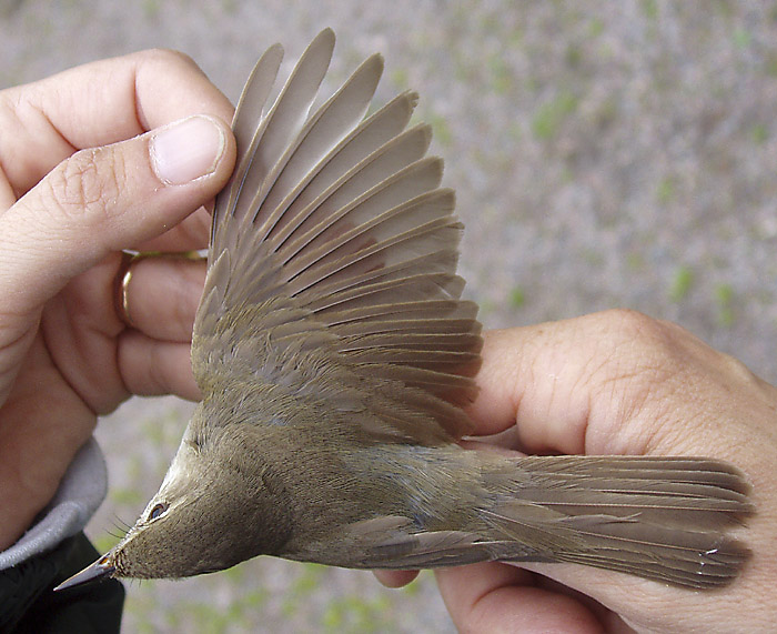 (10.) June 1995 Varkaus, central Finland. Note that "narrowing parts" of the outer webs of P8 and P7 form a line. Eurasian Reed Warbler has shorter emargination on P7 (if any).