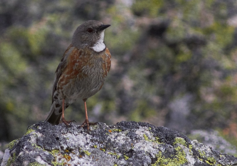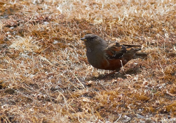 (7.) Alppirautiainen 23.3.2010 Sela Pass, Dirang, Arunachal, Intia. 4200 m. Värikkäimmillään lievästi kuluneessa "kevätpuvussa". Kurkku täplikäs ja tasaisen harmaa sekä tasaisen punaruskea alue alapuolella. Isojen peitinhöyhenten alue yhtenäisen musta neliö.
