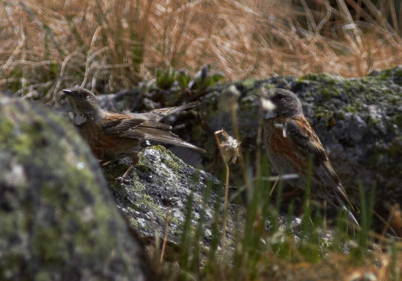(1.) Himalajanrautiainen. 13.7.2005 May Saz, Issyk-Kul Oblasti, Kirgisia, 3800 m. Kuluneessa puvussa. Selässä laajalti ruskeaa sävyä, poskessa punaruskeaa. Punaruskea ulottuu rinnan yli eikä ole yhtenäinen kupeillakaan edes näin kuluneessa puvussa. Kurkku on valkoinen ja sen alareunassa on mustahko rajaus. Nokka on musta kesällä.