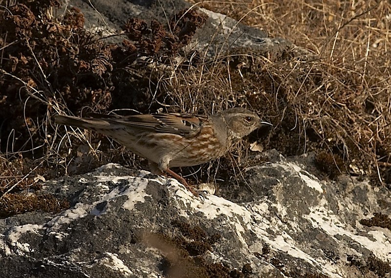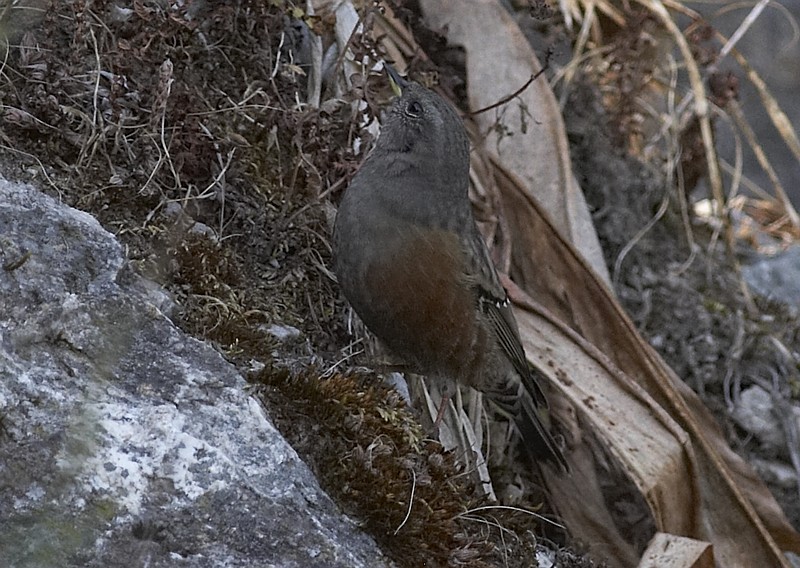 (5.) Alppirautiainen. 24.11.2007. Pangot, Uttarakhand, Intia.Muutamaa kuukautta myöhemmin kylkilaikku on jo kulunut yhtenäisen punaruskeaksi, rinnan keskiosa harmaa, ei ruskeaa korvahöyhenissä, silmäkulmajuova heikko.