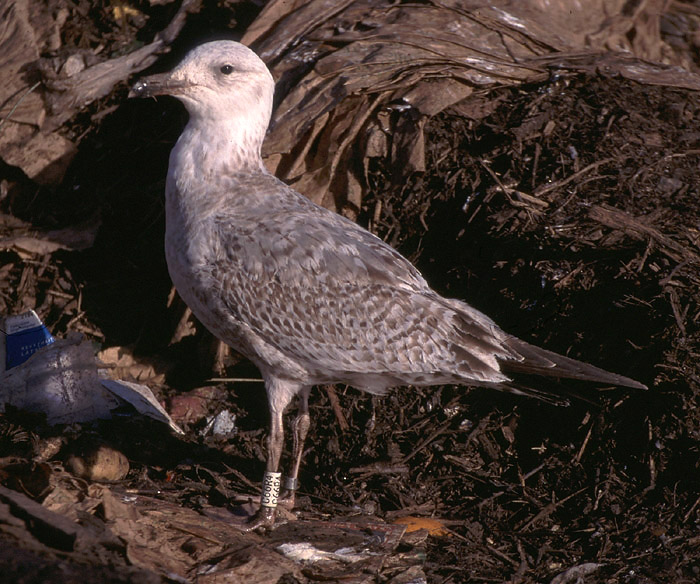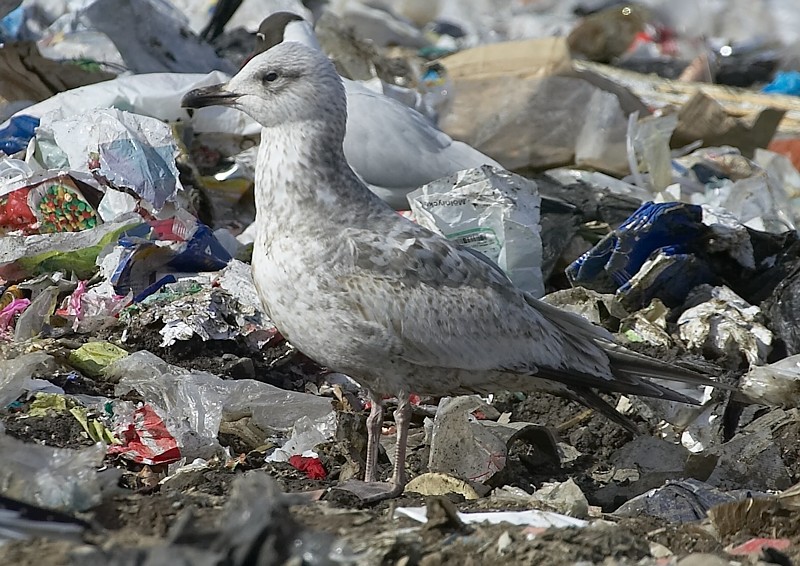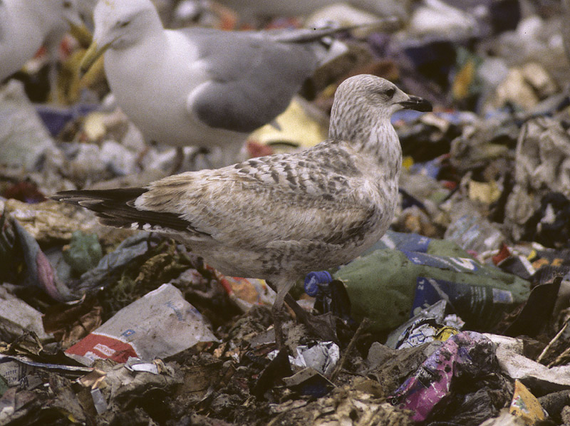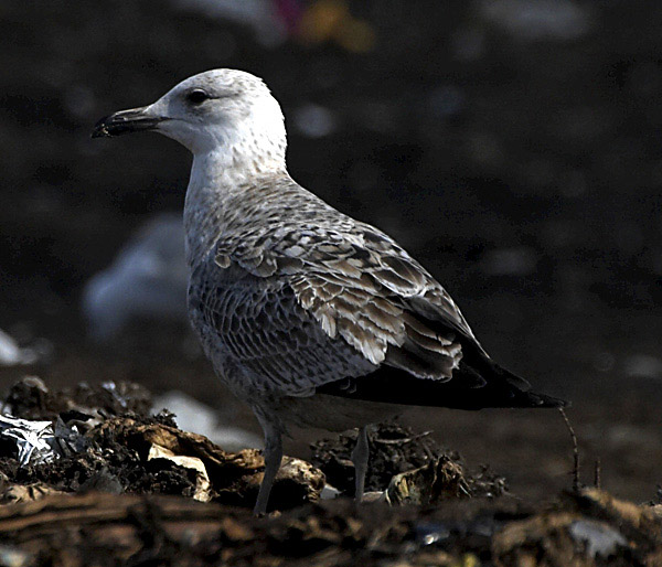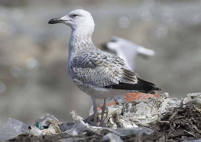 (10.) 23.4.2005 Tampere. Keskimääräistä selvästi tuoreempi lintu. On hämmästyttävää, miten paljon harmaalokeilla on yksilöllistä vaihtelua kulumisessa talven aikana.