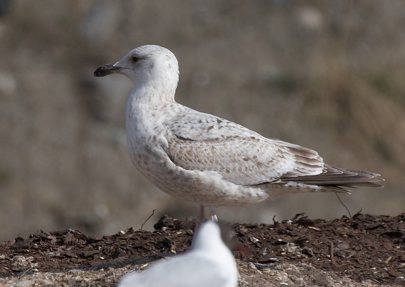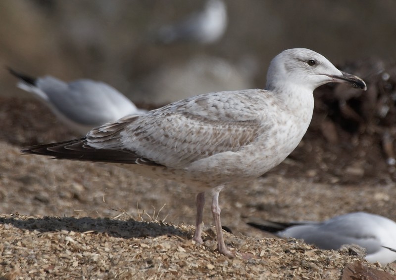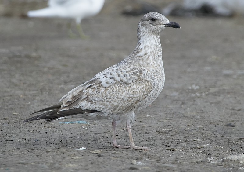 (2.) 23.4.2005 Tampere. Muutamilla on keväällä kulumisen seurauksena varsin vaalea pää, joka heti tuo jotain cachinnansmaista vaikutelmaa. Muuten tämä on aivan tyypillinen harmaalokki. Niskavyö epäselvempi kuin yleensä aroharmaalokilla.