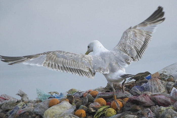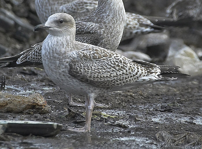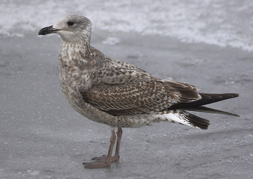 (4.) Nuori harmaalokki on hyvin vaihteleva. Talven tullen se muuttuu yleissävyltään harmaammaksi. 12.2.2005 Helsinki.