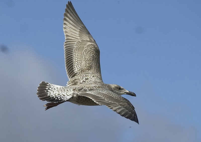 (5.) Nuori harmaalokki on lennossakin hyvin kirjava. Huomaa, kuinka siivet ovat vaaleammat kuin saman ikäisellä selkälokilla, erityisesti siiven kärjen lähellä oleva vaaleampi "luukku". 17.9.2005 Tampere.