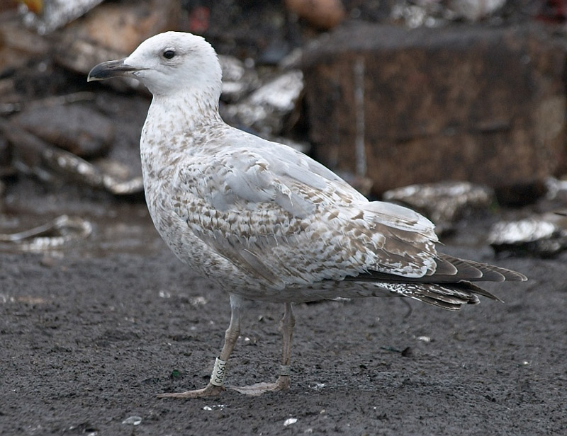 (6.) Esiaikuisuutensa ajan harmaalokki on vaihtelevasti harmaa ja ruskeankirjava. Tässä lintu noin kaksi vuotta syntymänsä jälkeen. 7.6.2003 Tampere (rengas C6S61, syntynyt vuonna 2001)
