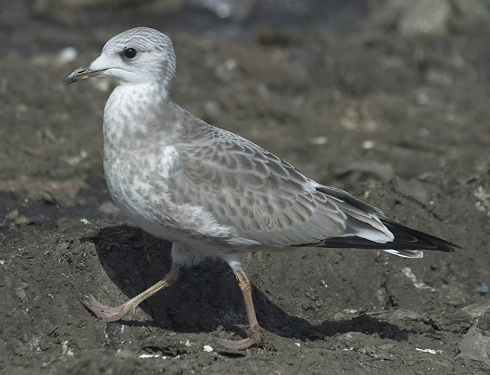 (3.) Nuori kalalokki on ruskeanharmaa ja kuvioitu selkäpuolelta. Kuviointi on yksinkertaisempaa kuin isoilla lokeilla. Nokka on myös selvästi hennompi. 8.8.2004 Tampere.