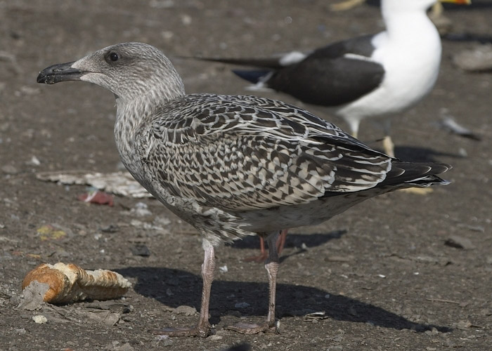 (2.) Nuori merilokki muistuttaa suuresti nuorta harmaalokkia, mutta nokka on tukevampi. 18.7.2004 Tampere.