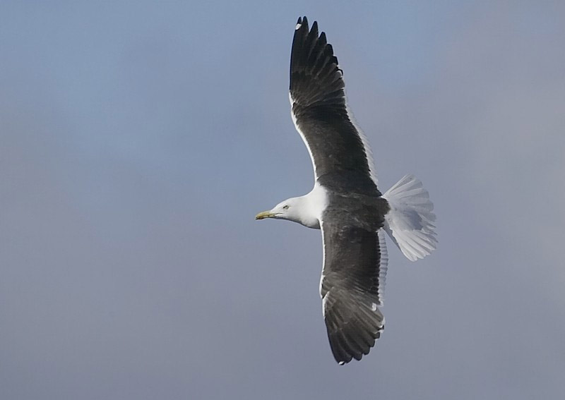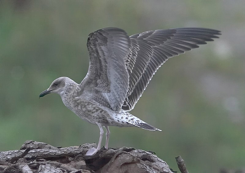 (4.) Nuoren selkälokin hyvä tuntomerkki harmaalokkiin verrattuna on tummempi siipi. Kiinnitä huomiota erityisesti siihen, että siiven takaosa on melkein tasatumma ruumiista siiven kärkeen asti. 14.8.2005 Tampere.