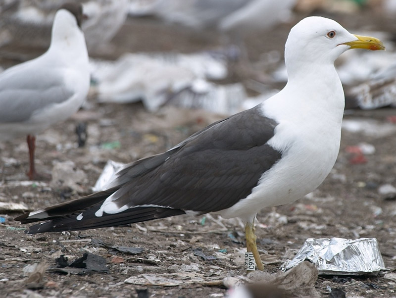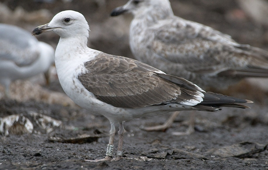 (5.) Noin vuoden ikäinen selkälokki on vaihteleva, mutta muistuttaa yleensä rusehtavaa ja haalistunutta muunnelmaa aikuisesta linnusta. Tämän ikäiset linnut ovat Suomessa melko vähälukuisia. 7.6.2003 Tampere (rengas CHYE).