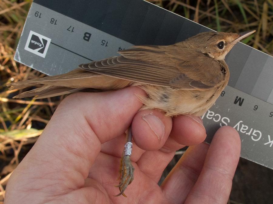 These young Blyth's Reed and Marsh Warblers were trapped at the same time, both from the sea side, so these birds were already mature enough to move to the reedbeds from their birth habitat in the bushes. The upperside colour of MW was yellowish buff, that of BRW with a colder olive tone - both very typical. The BRW shows distinct fault-bars - I do not remember seeing those in this species before. Probably cool rainy days in June caused problems for the parents to feed their young.