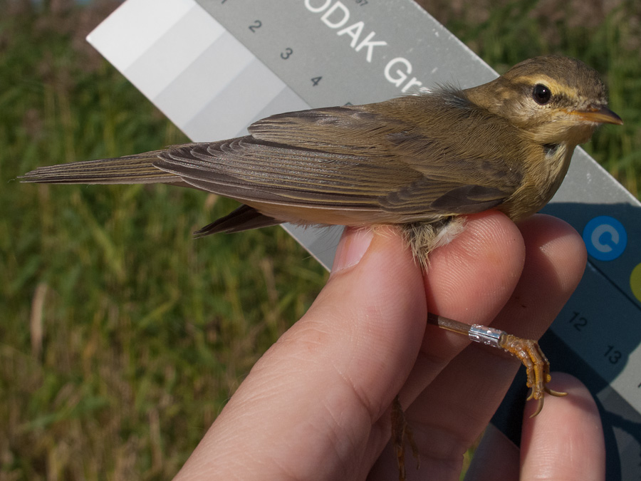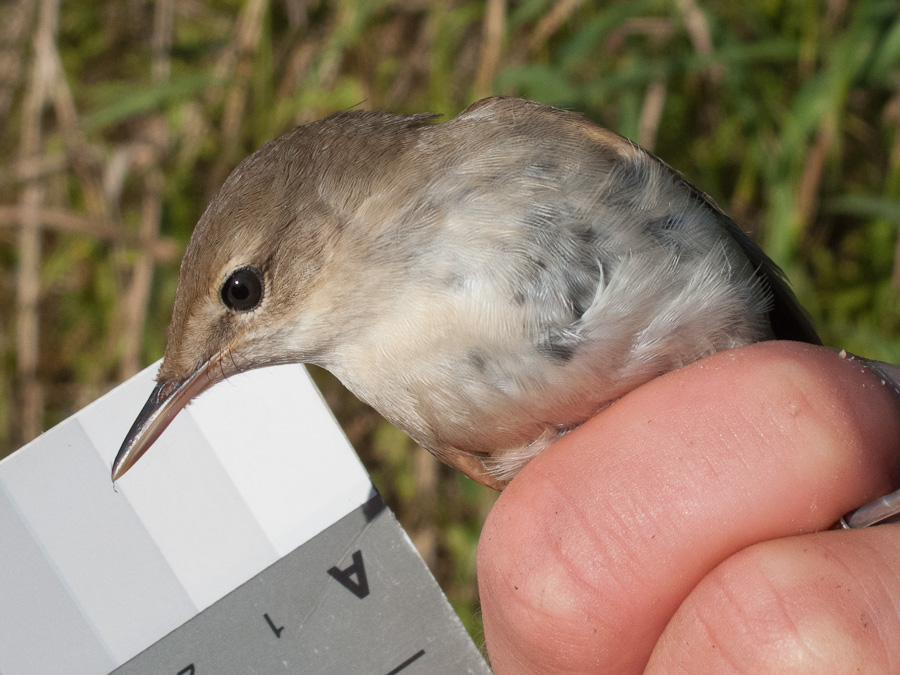 This retrapped Blyth's Reed Warbler was in the highest fat score category and weighted 17.1 g. It may have accumulated as much as 6 g of fat and protein for the migration, and this should be enough for a 2000 km non-stop flight in favourable winds, so it will soon be close to the Caspian Sea. On the other other hand, this is the easier part of its long migration, with the Central Asian deserts and mountains surely much more challenging. The adults seem to leave this country soon after breeding without preparing for a long flight, and leave fattening until much later.