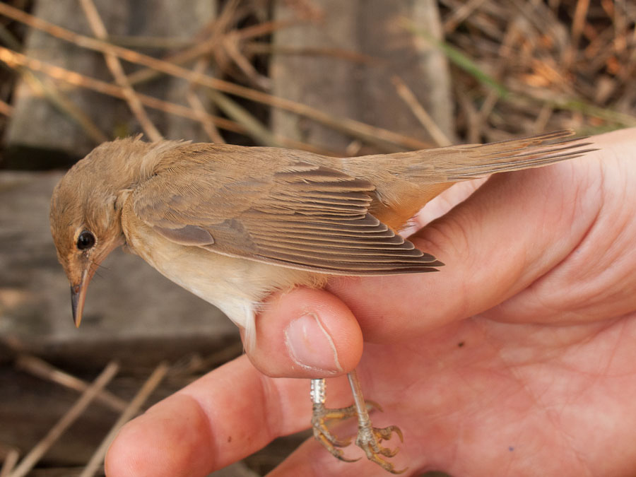 While most of the unstreaked Acrocephalus warblers are relatively straightforward to identify in the hand, there are regularly also more difficult individuals. This Marsh Warbler seemed somewhat rufous and darkish resembling Eurasian Reed in these traits. Also the wing length of 66mm was short for Marsh Warbler, and closer to the average of Eurasian Reed, and the length of the hindclaw, 6.9mm, fits Eurasian Reed better (which as a reed specialist has longer claws). However, short notches on the inner web of the second outermost primary (9.2 mm) and outer web of the third outermost primary, yellowish legs and claws and a short bill point to Marsh Warbler. Also, the overall colour, while more rufous than many Marsh Warblers, is still closer to that species.
