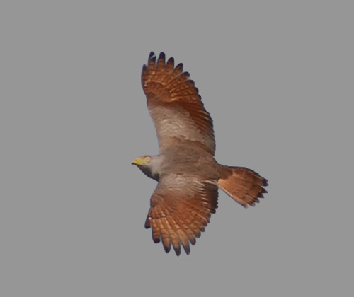 Rufous-winged Buzzard, adult. Darkish brown overall, with grey tinge on head. Orange base of the bill and yellowish eye are visible to quite long distances. Cambodia 19 December 2016.